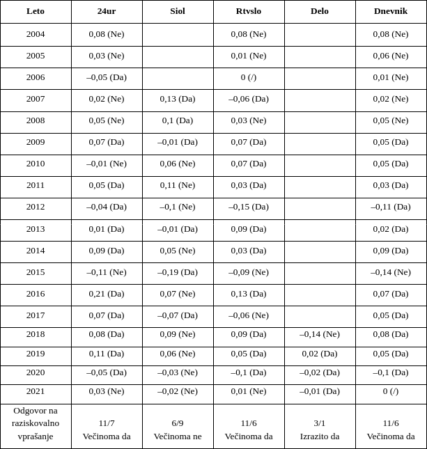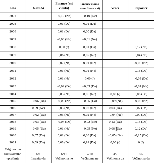 To naredimo za vsako leto posebej in za najbolj znane spletne medije v zadnjih letih in dobimo razpredelnici, v katerih je za posamezno leto in posamezen medij izračunana regresijska premica. Pri posamezni izračunani vrednosti je v oklepaju odgovor na naše raziskovalno vprašanje. Odgovor na raziskovalno vprašanje je pritrdilen, če je večina odgovorov za posamezen medij skozi obdobja pritrdilna, in obratno, npr. spletni medij 24ur ima v 18 letih zabeleženih 11 let, ki sledijo predpostavljenemu političnemu nazoru, in 7 let, ko ne (da – 11, ne – 7), zato je odgovor na raziskovalno vprašanje 1 za spletni medij 24ur »večinoma da«.