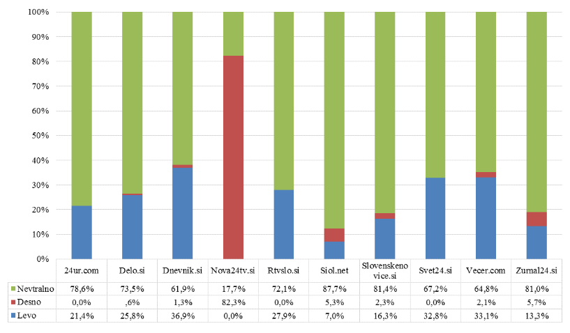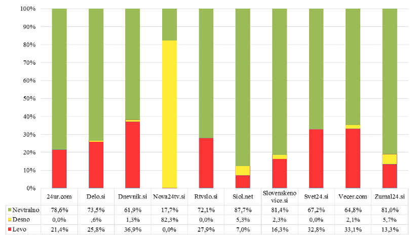 - Izjemo predstavlja medij Siol.net, kjer je ob visokem deležu nazorno nevtralnih objav razmeroma uravnoteženo tudi razmerje med levimi (7,0 %) in desnimi (5,3 %) objavami.